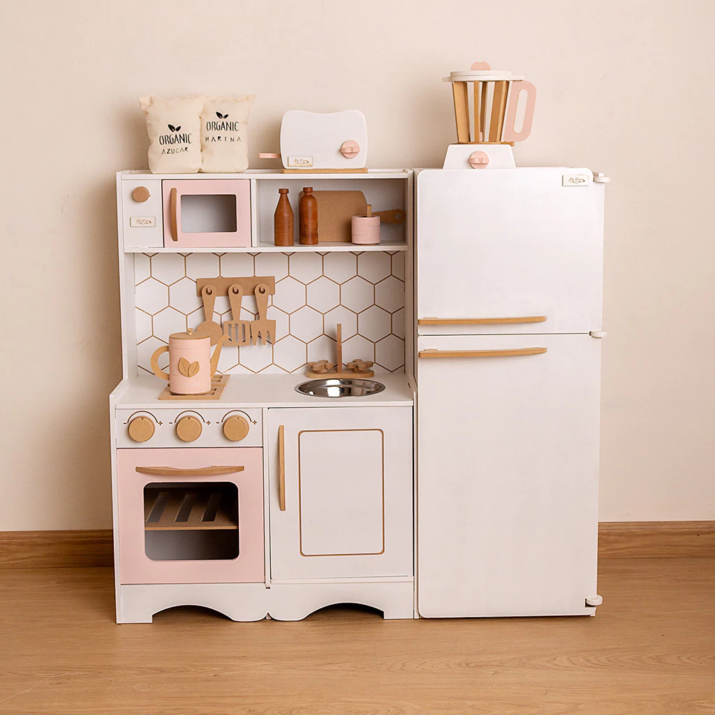 Cocina Antón fabricada en MDF de 9 mm pintada con hidroesmalte. La puerta del horno se abre para abajo (como los hornos de verdad!!!) y todas las perillas y griferia giran. Incluye set de utensillos (cucharon, espatula, tenedor) y tablita. Medidas: 90 cm de alto, 60 cm de largo, 33 cm de ancho.